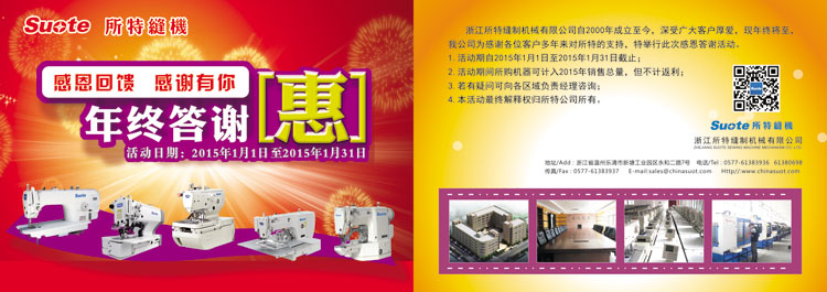 浙江所特縫制機(jī)械有限公司自2000年成立至今,深受廣大客戶厚愛(ài),現(xiàn)年終將至,我公司為感謝各位客戶多年來(lái)對(duì)所特的支持,現(xiàn)公司將拿出電腦平車600臺(tái),電腦平頭鎖眼機(jī)50臺(tái)進(jìn)行感恩答謝活動(dòng)。