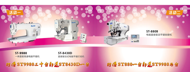 1,活動(dòng)期間夠得電腦平車ST-9980三十臺(tái)即送電子套結(jié)機(jī)ST-8430D一臺(tái);購(gòu)得電子平頭鎖眼機(jī)ST-8800B一臺(tái)即送ST-9980兩臺(tái)